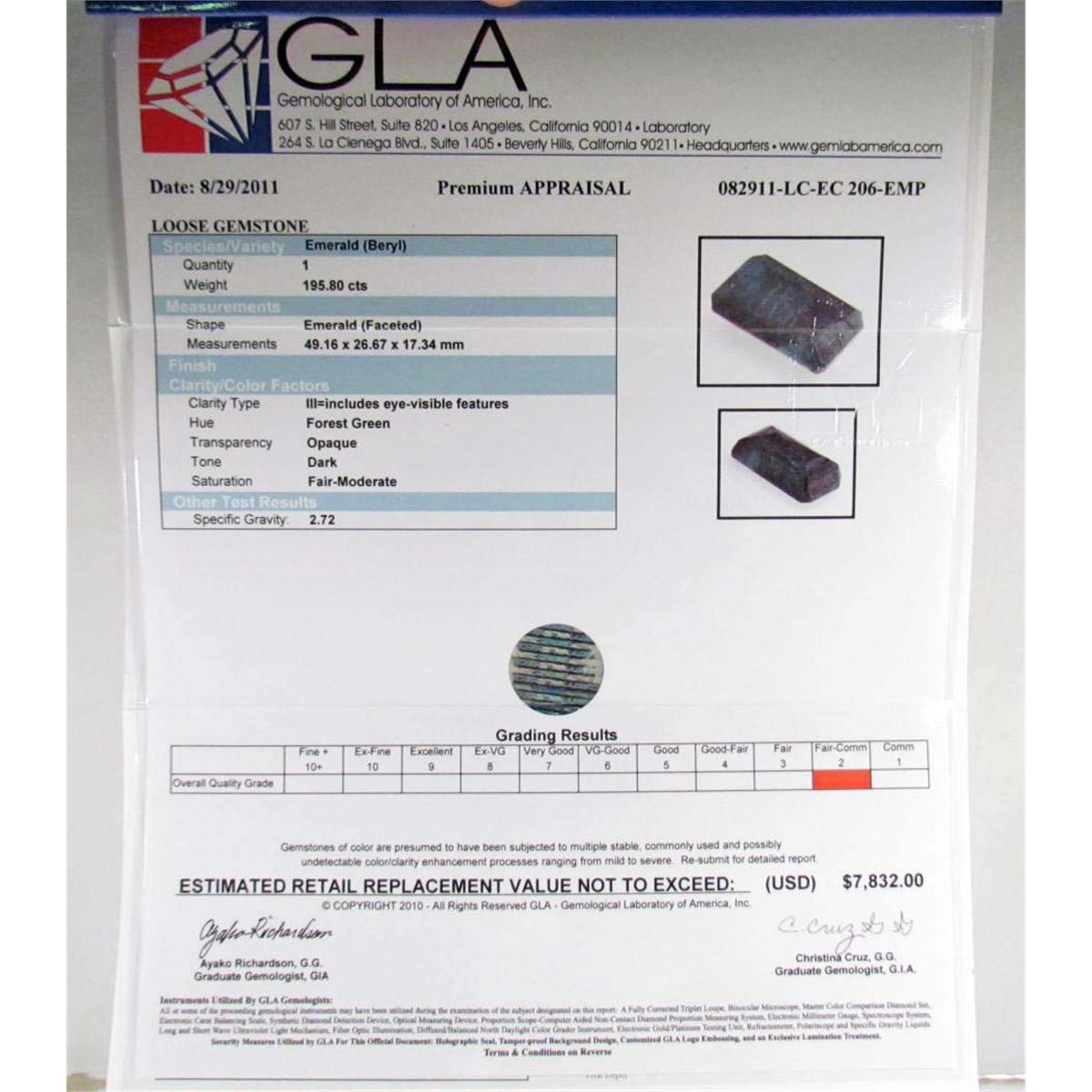 Comes w/ GLA Appraisal of $7,832.00. Emerald is 49.16 by 26.67 by 17.34 mm. Overall quality is Fair-Comm