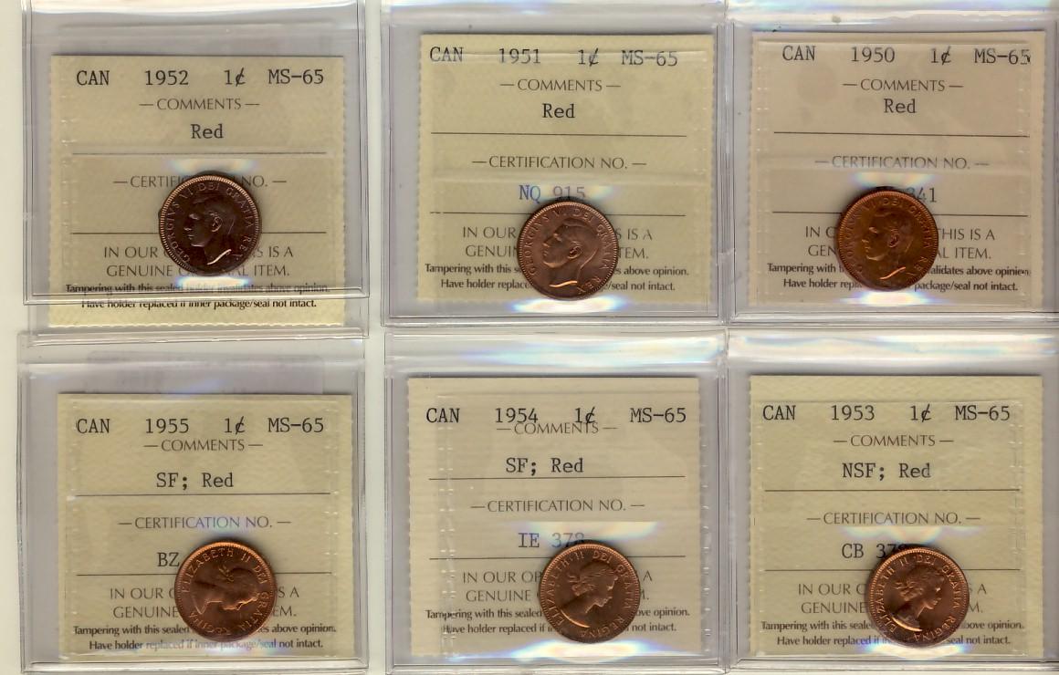 1950 1¢, 1951, 1952, 1953 NSF, 1954 SF & 1955 ICCS MS65RD. Lot of 6 coins.