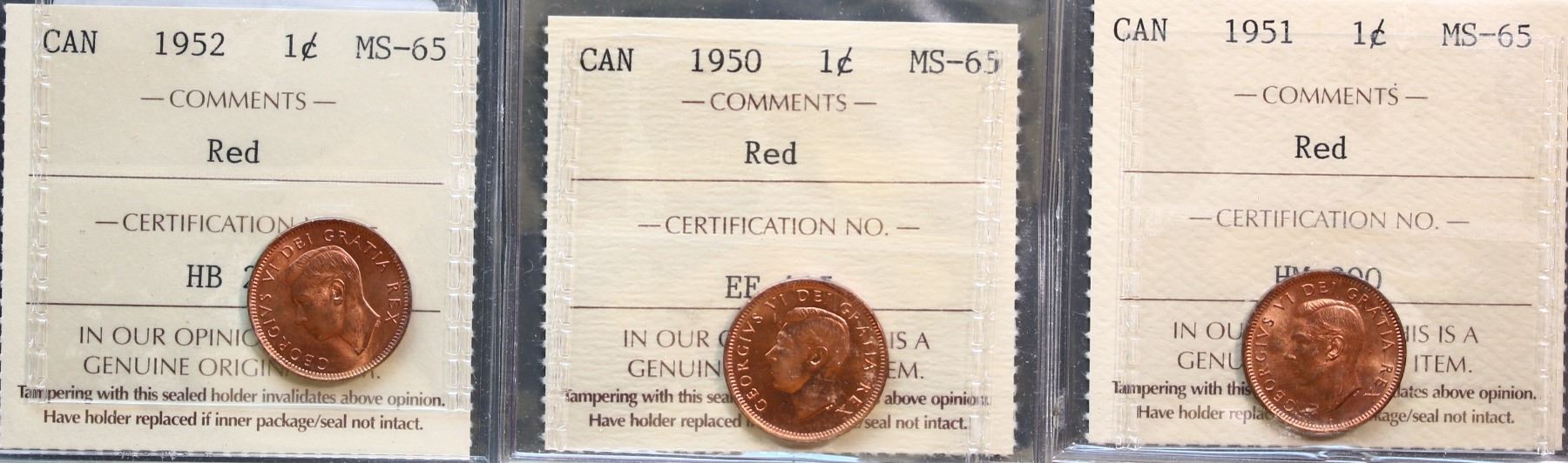 1950 1¢, 1951, and 1952, all ICCS Gem Mint State-65RED, lot of 3 coins.