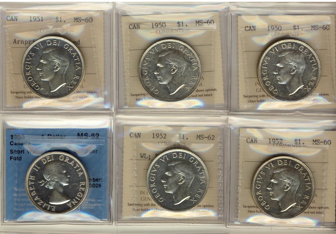 1950 $1(2), 1950 Arnp & 1952 WL MS60, 1952 WL MS62 & 1953 NSF, SWL MS62. Lot of 6 3rd party graded coins.