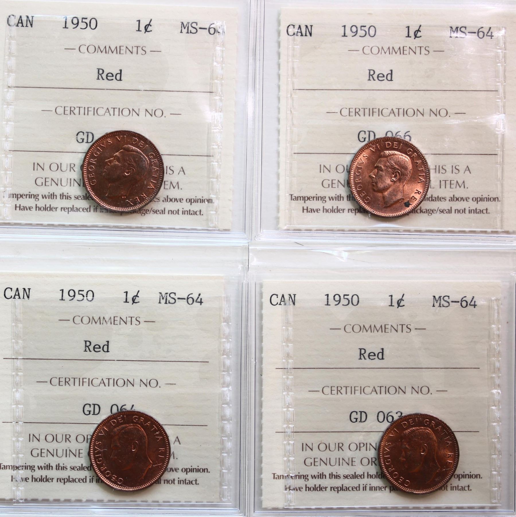 1950 1¢ (4). Lot of 4 coins all certified ICCS Choice Mint State-64 Red