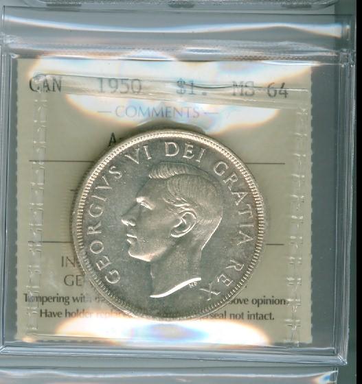 1950 $1 Arnprior ICCS MS64. Light golden rim toning.