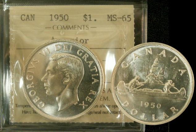 1950 $1 Arnprior ICCS MS65, fully brilliant and lustrous. A tough coin to find. Rare
