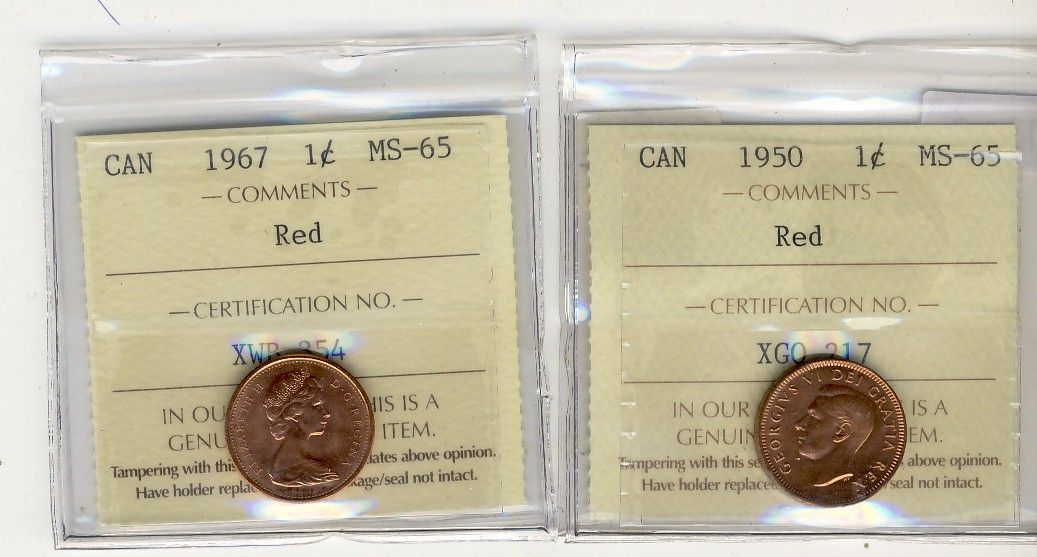 1950 1 Cent, 1967 ICCS MS65; Red. Two coins.