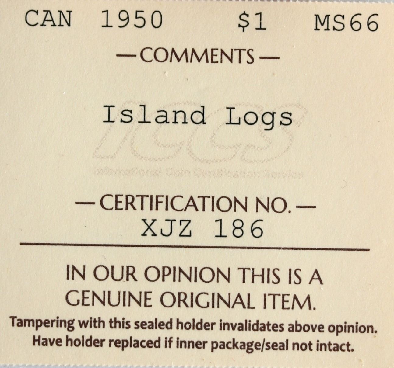 1950 $1 "Island Logs" ICCS Superb Gem Mint State-66 Lustrous with very light russet tone. Very nice fields and clean surfaces.