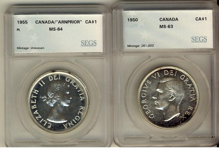1950 $1 MS63 & 1955 Arnp MS64. Lot of 2 coins both SEGS. 1950 looks to be a SWL and the 1955 should read Proof like and not MS.