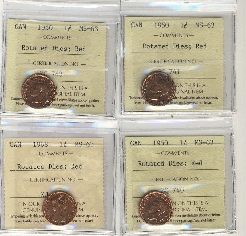 1950 1¢ Rotated Dies ICCS MS63RD. Lot of 4 coins.
