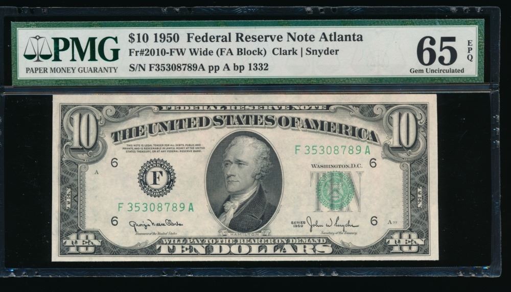 One 1950 $10 Atlanta FRN PMG 65EPQ.