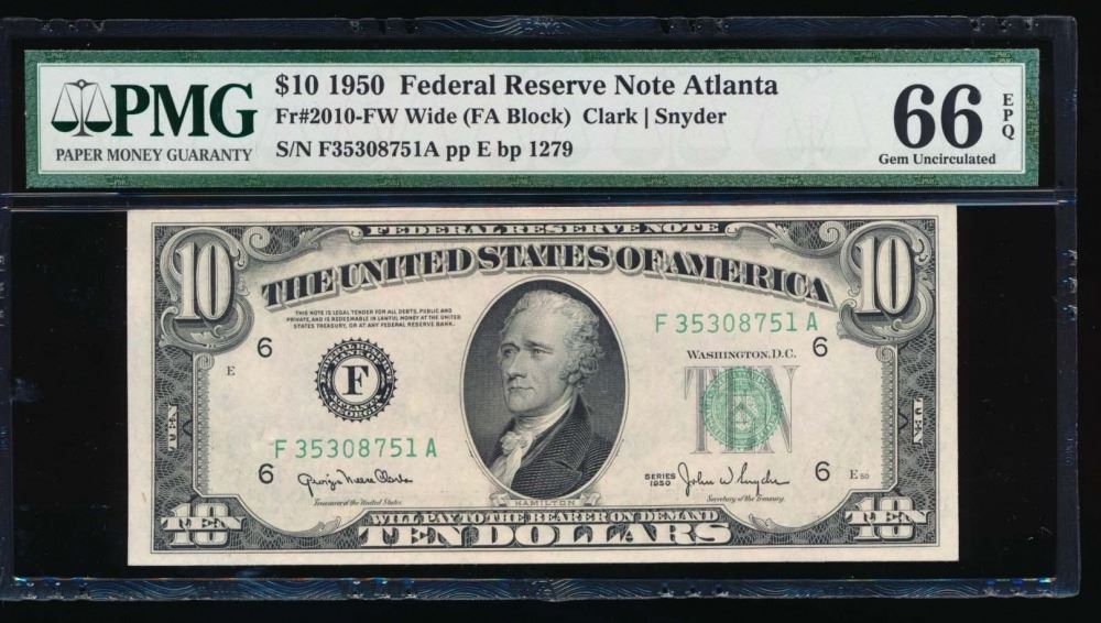 One 1950 $10 Atlanta Federal Reserve Note PMG 66EPQ.