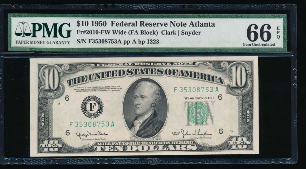 One 1950 $10 Atlanta Federal Reserve Note PMG 66EPQ.
