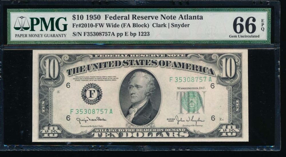 One 1950 $10 Atlanta Federal Reserve Note PMG 66EPQ.