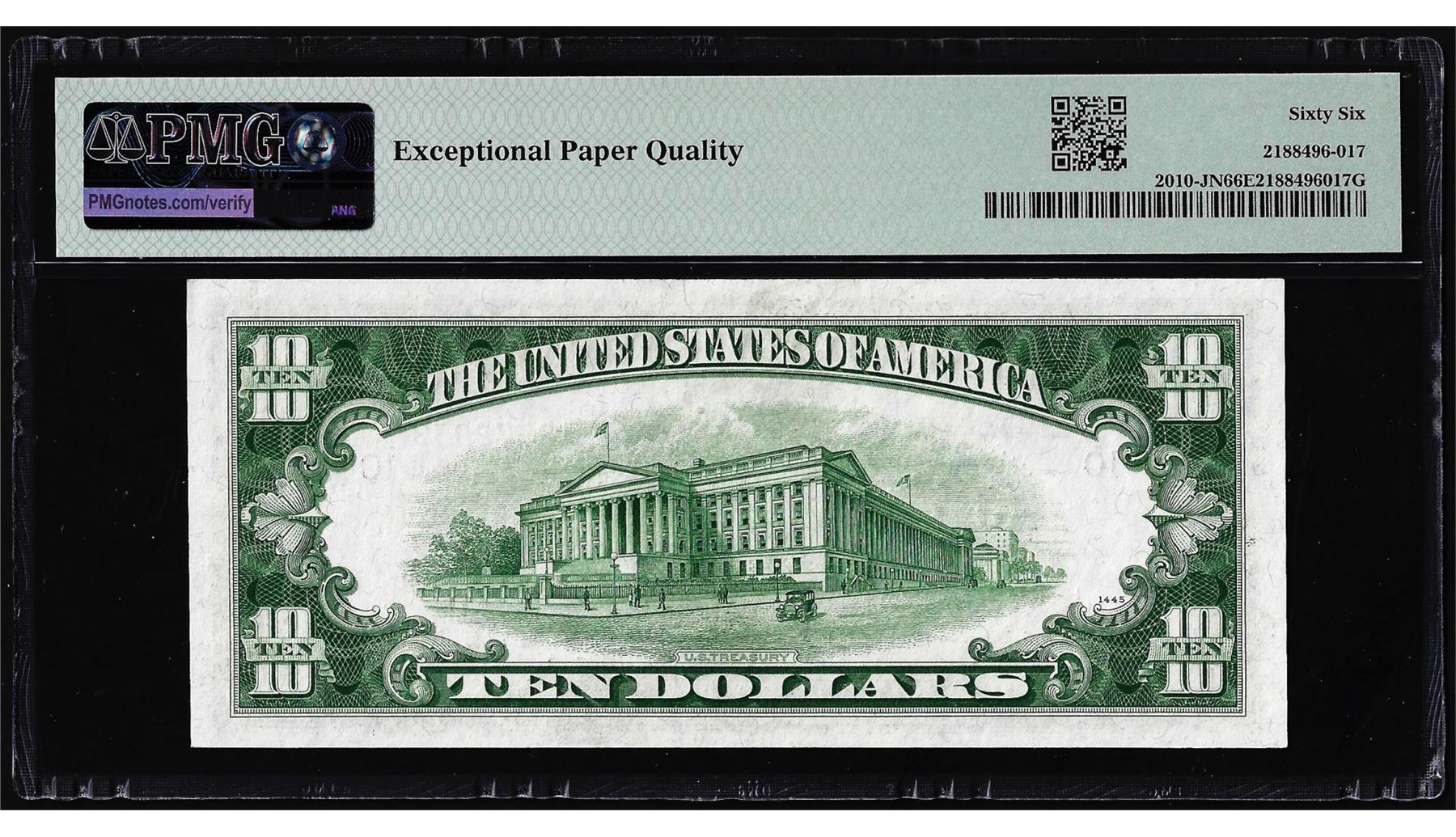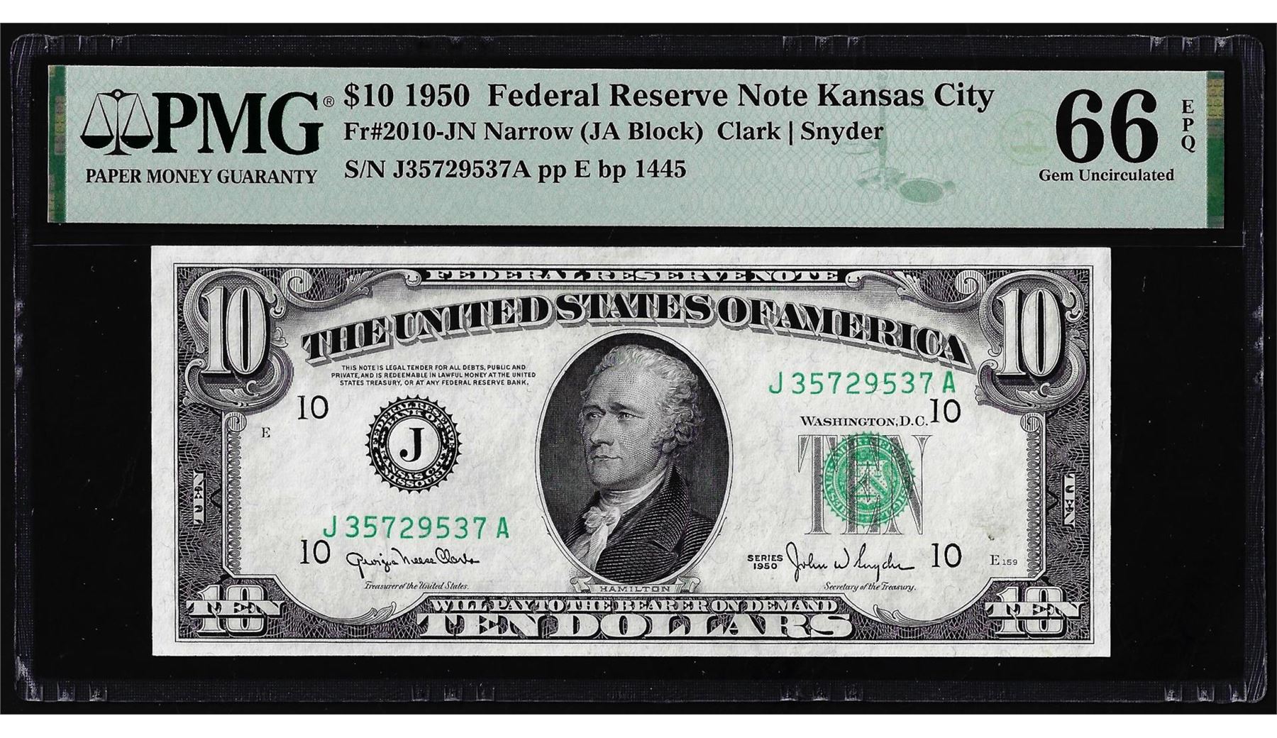 One 1950 $10 Federal Reserve Note Kansas City Fr.2010-J Narrow PMG Gem Uncirculated 66EPQ. PMG Certified.