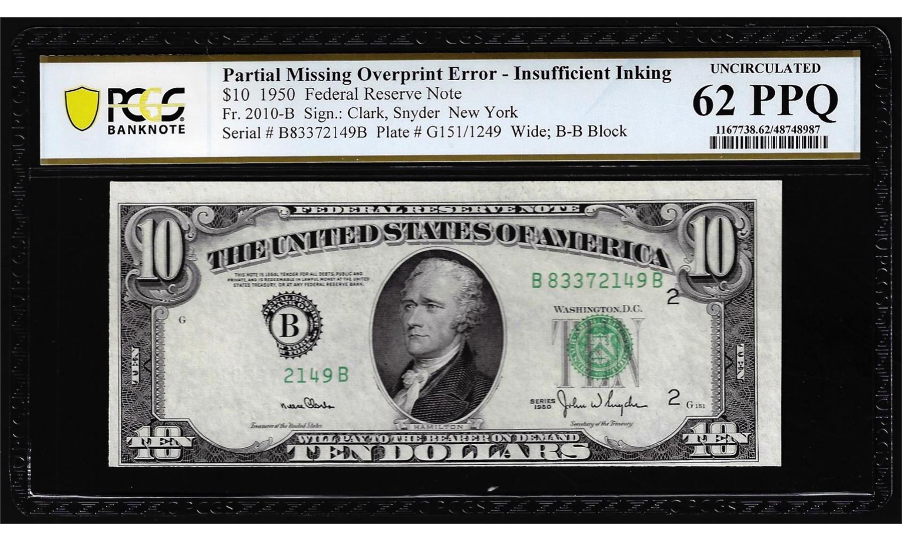 1950 $10 Federal Reserve Note NY Insufficient Inking Error PCGS Uncirculated 62PPQ