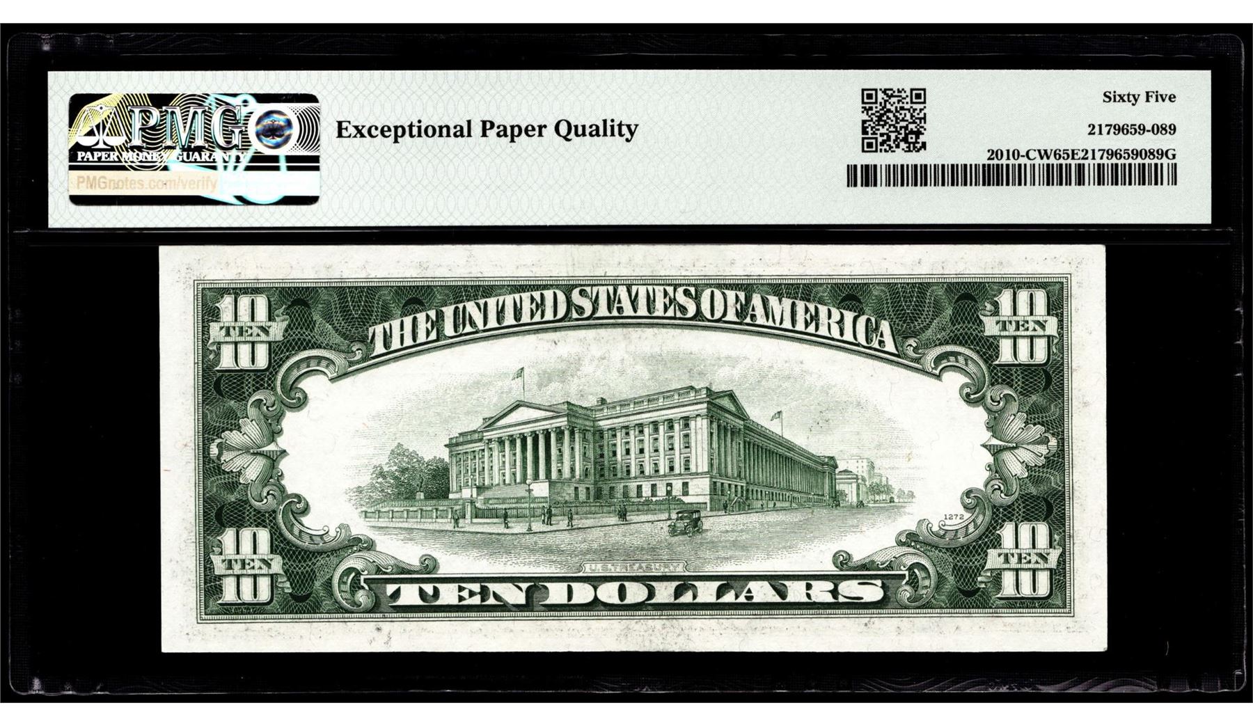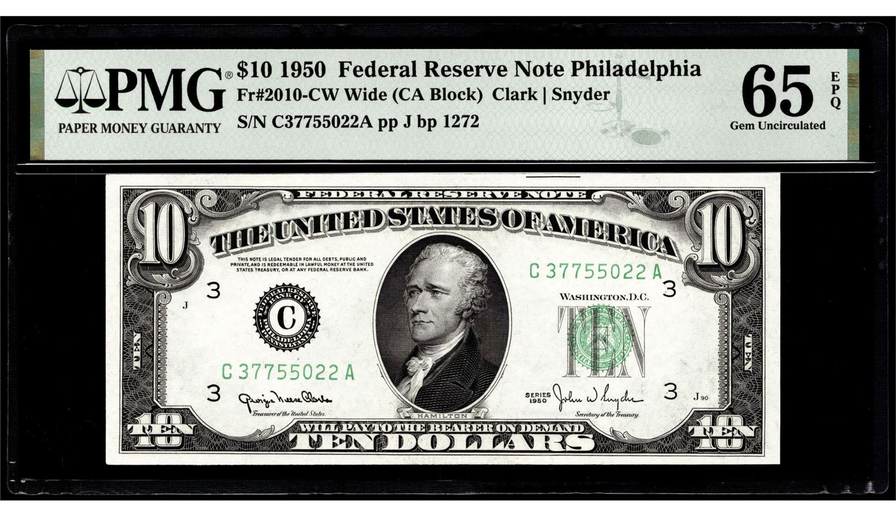 One 1950 $10 Federal Reserve Note Philadelphia Fr.2010-CW Wide PMG Gem Uncirculated 65EPQ. PMG Certified.