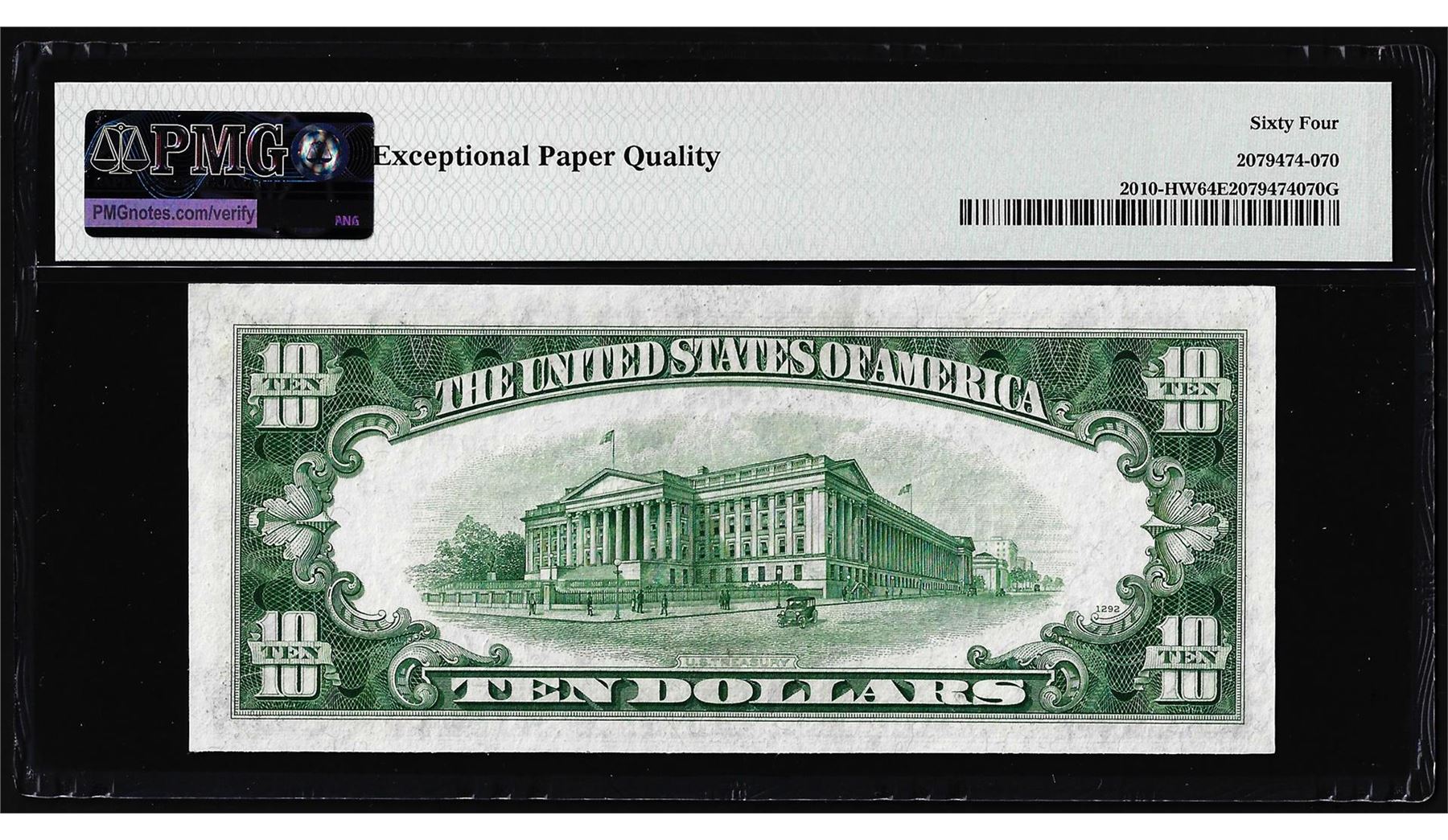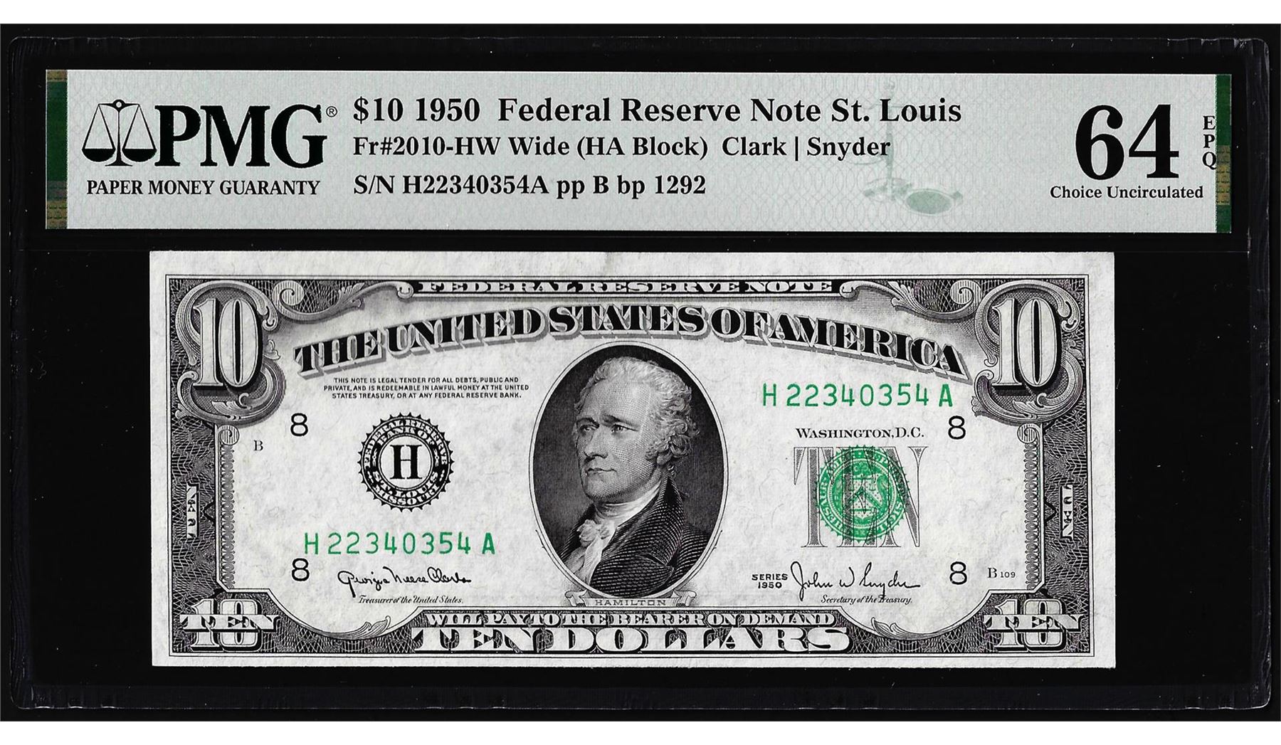 One 1950 $10 Federal Reserve Note St. Louis Fr.2010-HW PMG Choice Uncirculated 64EPQ. PMG Certified.