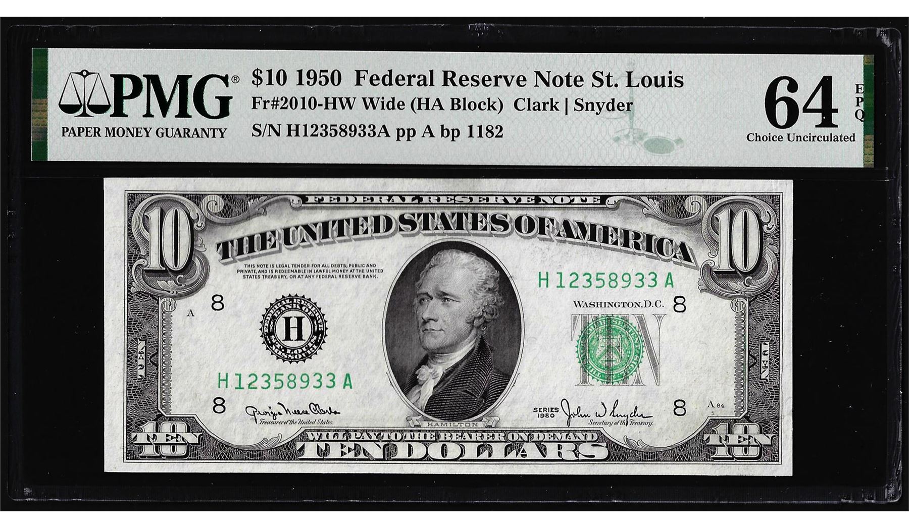 One 1950 $10 Federal Reserve Note St. Louis Fr.2010-HW PMG Choice Uncirculated 64EPQ. PMG Certified.