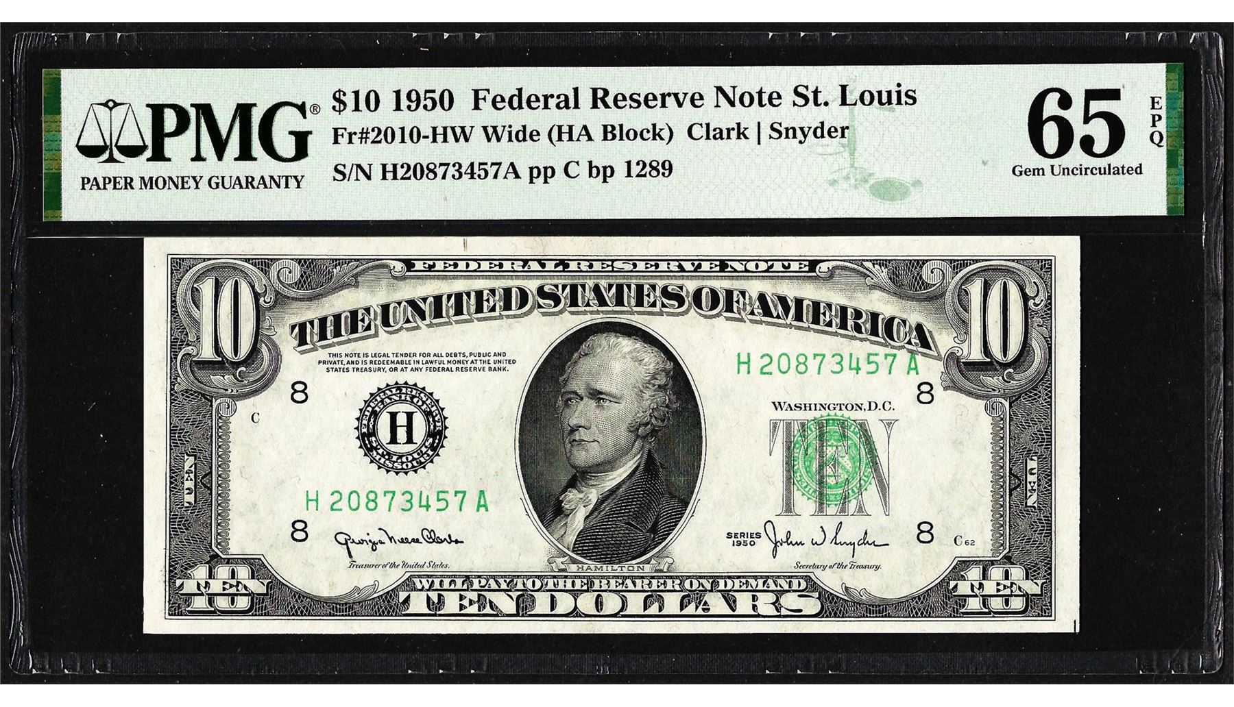1950 $10 Federal Reserve Note St. Louis Fr.2010-HW PMG Gem Uncirculated 65EPQ