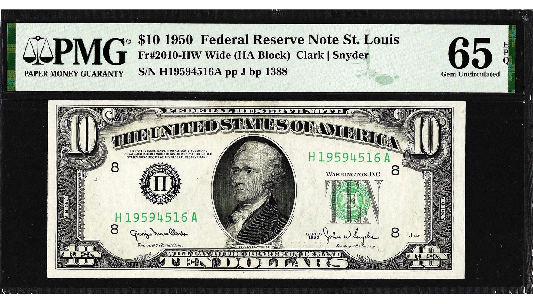 One 1950 $10 Federal Reserve Note St. Louis Fr.2010-HW PMG Gem Uncirculated 65EPQ. PMG Certified.