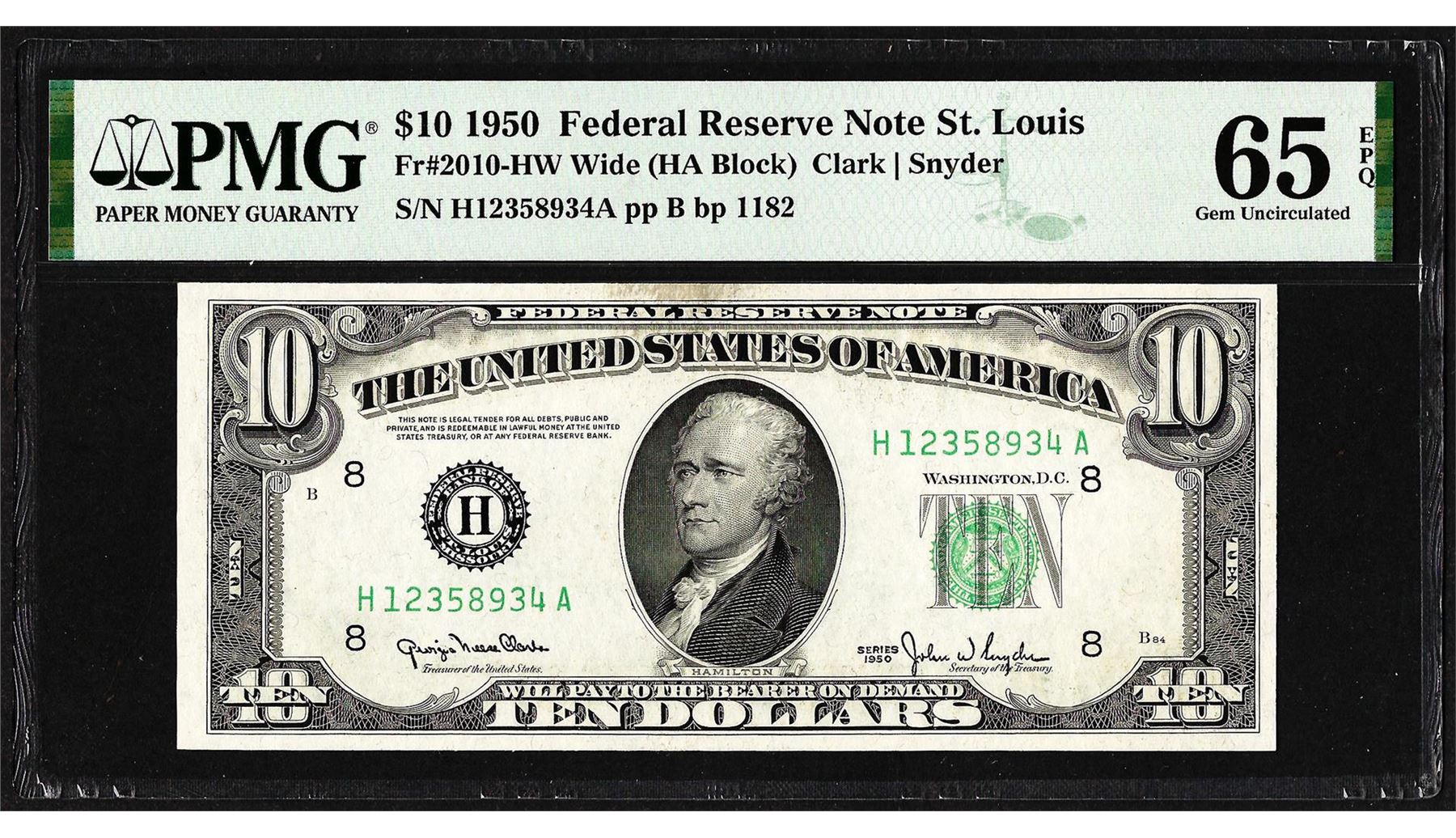 One 1950 $10 Federal Reserve Note St. Louis Fr.2010-HW PMG Gem Uncirculated 65EPQ. PMG Certified.