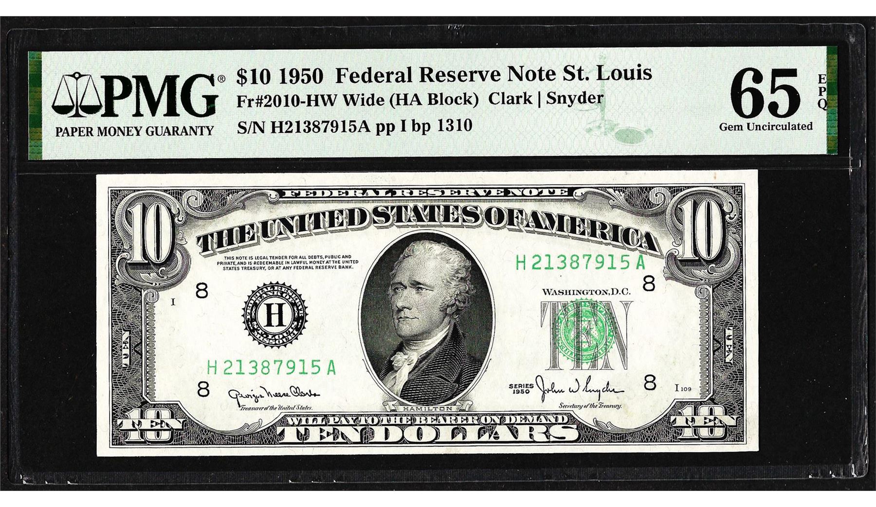 One 1950 $10 Federal Reserve Note St. Louis Fr.2010-HW PMG Gem Uncirculated 65EPQ. PMG Certified.