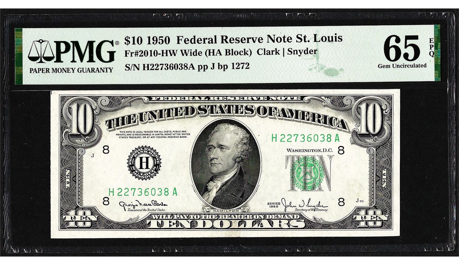 One 1950 $10 Federal Reserve Note St. Louis Fr.2010-HW PMG Gem Uncirculated 65EPQ. PMG Certified.