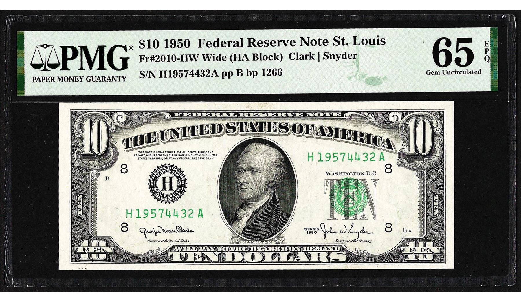 One 1950 $10 Federal Reserve Note St. Louis Fr.2010-HW PMG Gem Uncirculated 65EPQ. PMG Certified.