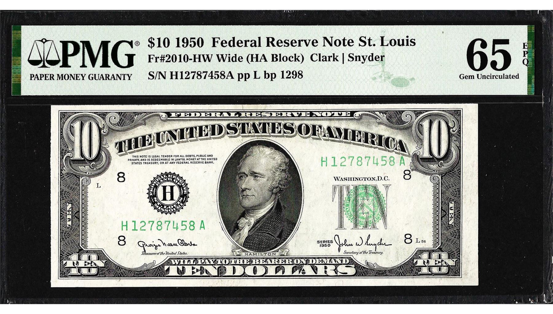 One 1950 $10 Federal Reserve Note St. Louis Fr.2010-HW PMG Gem Uncirculated 65EPQ. PMG Certified.