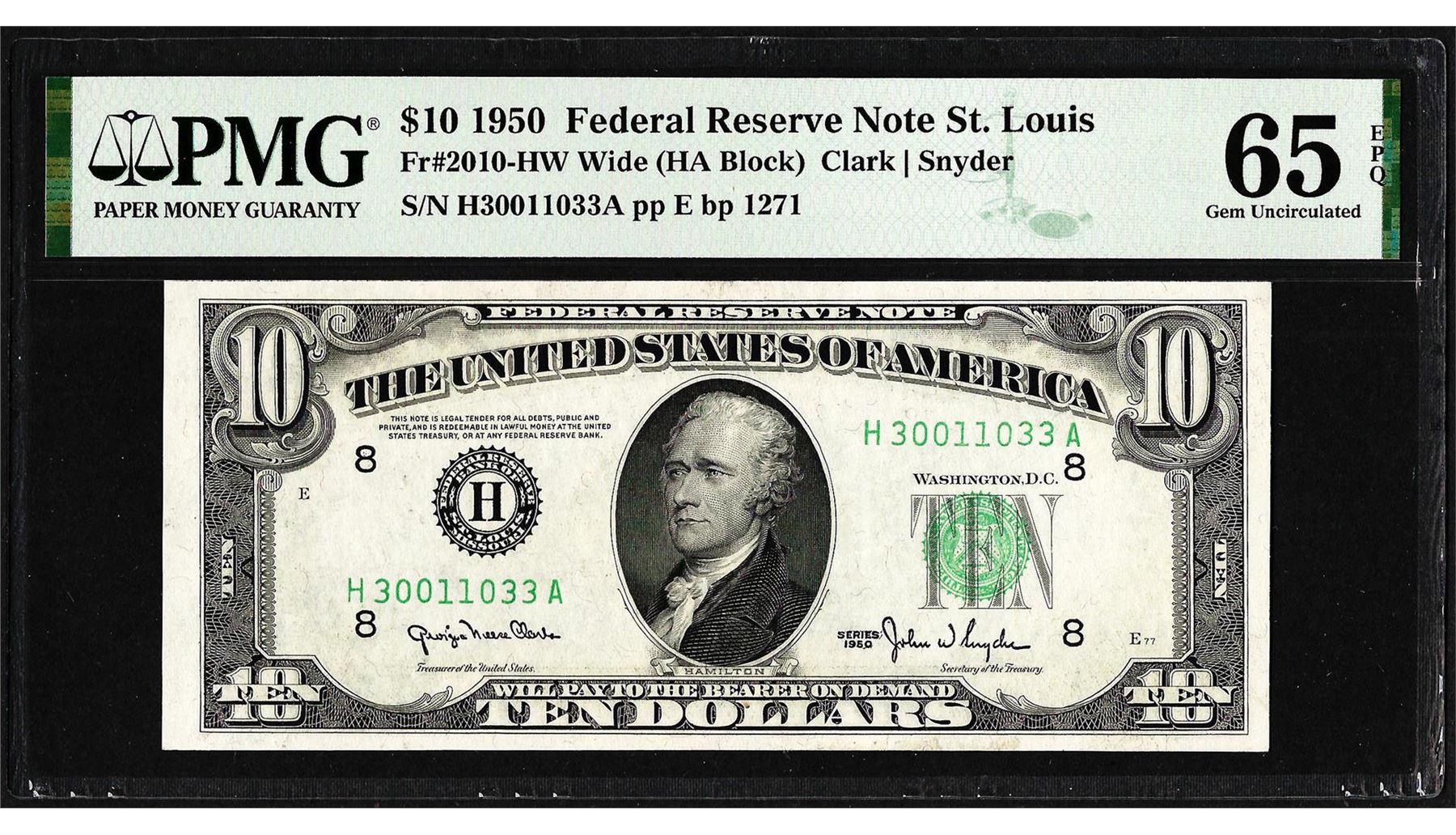 One 1950 $10 Federal Reserve Note St. Louis Fr.2010-HW PMG Gem Uncirculated 65EPQ. PMG Certified.