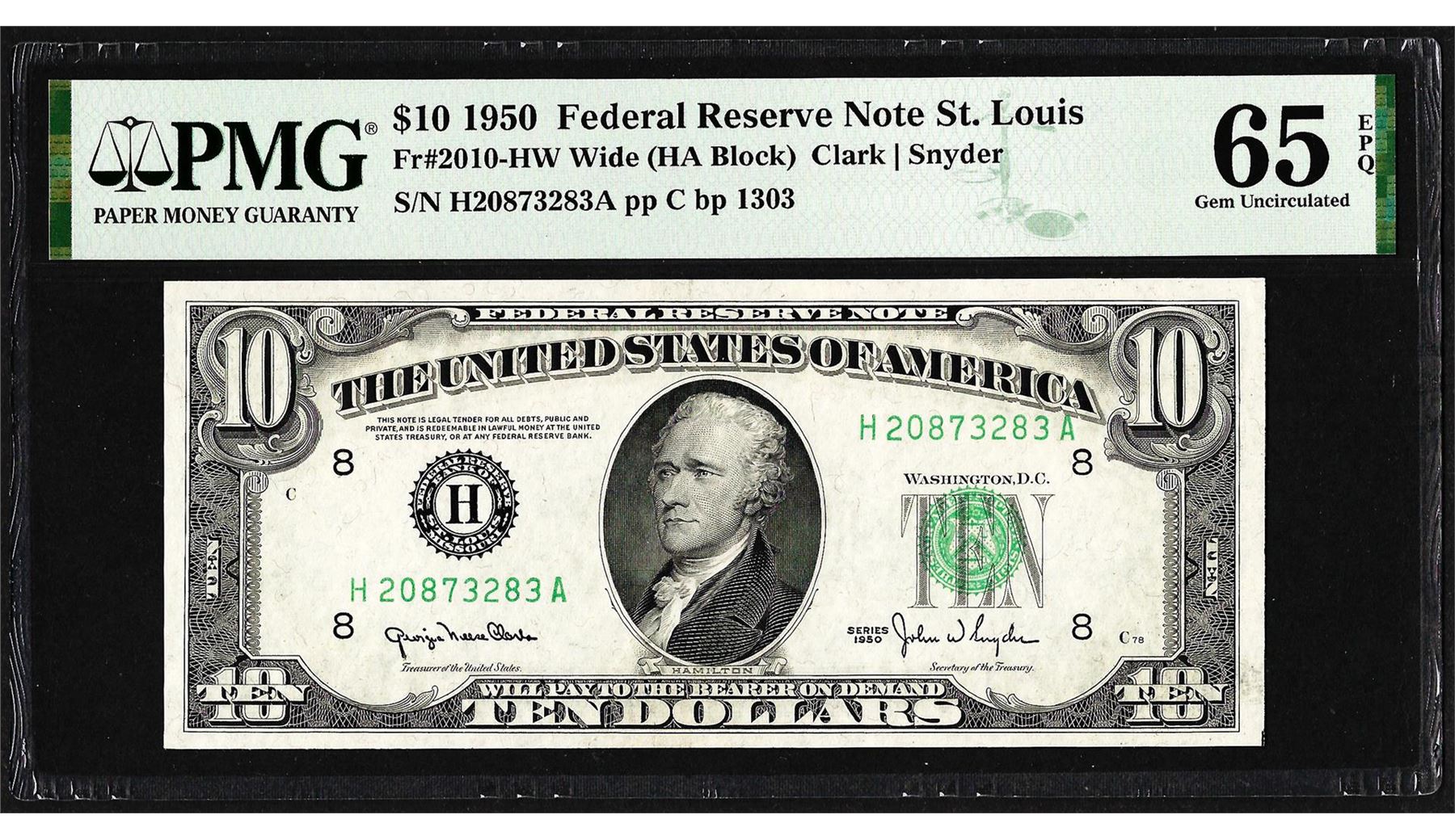 One 1950 $10 Federal Reserve Note St. Louis Fr.2010-HW PMG Gem Uncirculated 65EPQ. PMG Certified.