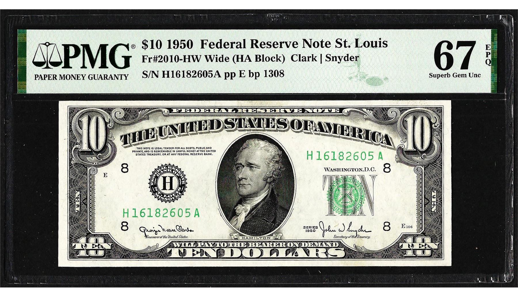 One 1950 $10 Federal Reserve Note St. Louis Fr.2010-HW PMG Superb Gem Uncirculated 67EPQ. PMG Certified.