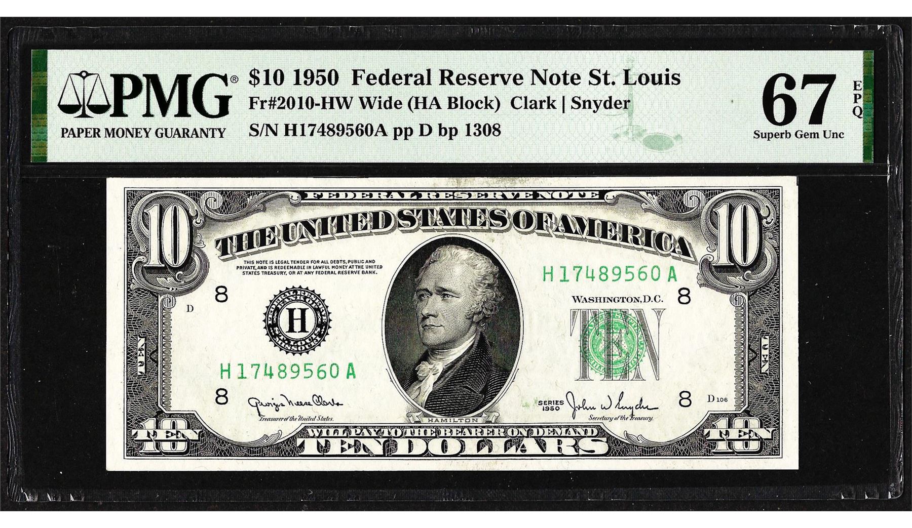 One 1950 $10 Federal Reserve Note St. Louis Fr.2010-HW PMG Superb Gem Uncirculated 67EPQ. PMG Certified.