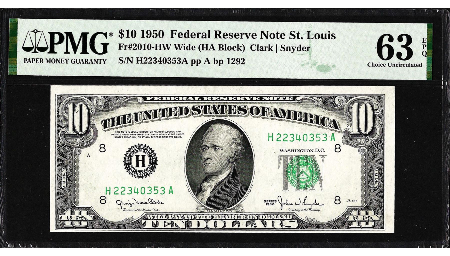 One 1950 $10 Federal Reserve Note St. Louis Fr.2010-HW Wide PMG Choice Uncirculated 63EPQ. PMG Certified.