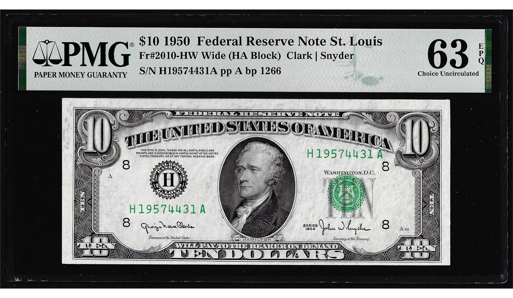 One 1950 $10 Federal Reserve Note St. Louis Fr.2010-HW Wide PMG Choice Uncirculated 63EPQ. PMG Certified.