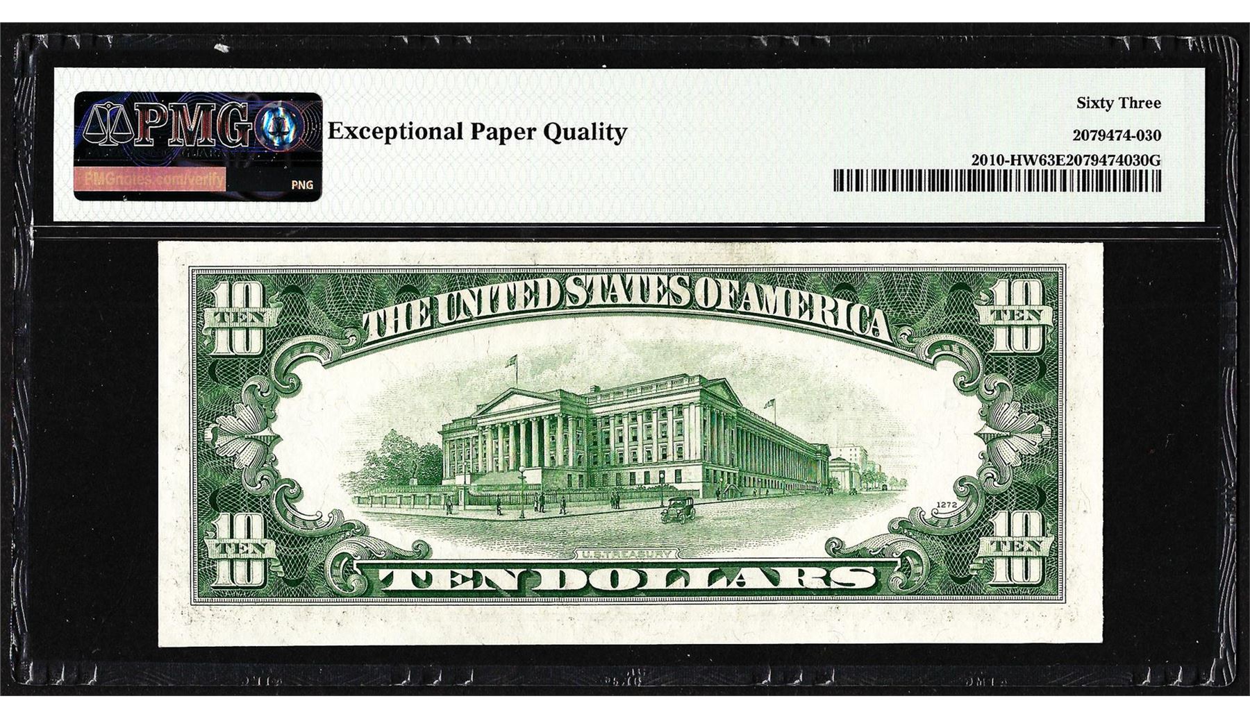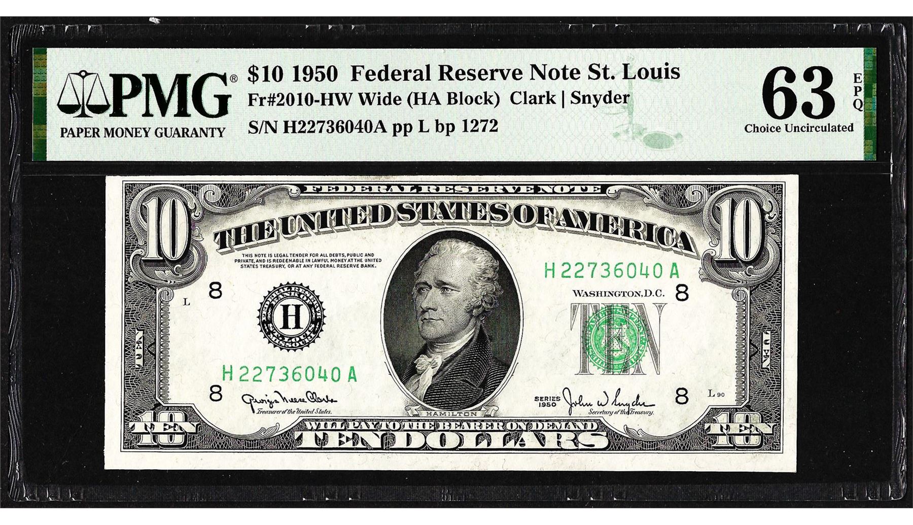 One 1950 $10 Federal Reserve Note St. Louis Fr.2010-HW Wide PMG Choice Uncirculated 63EPQ. PMG Certified.