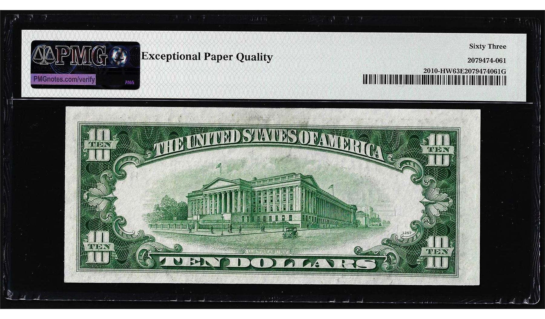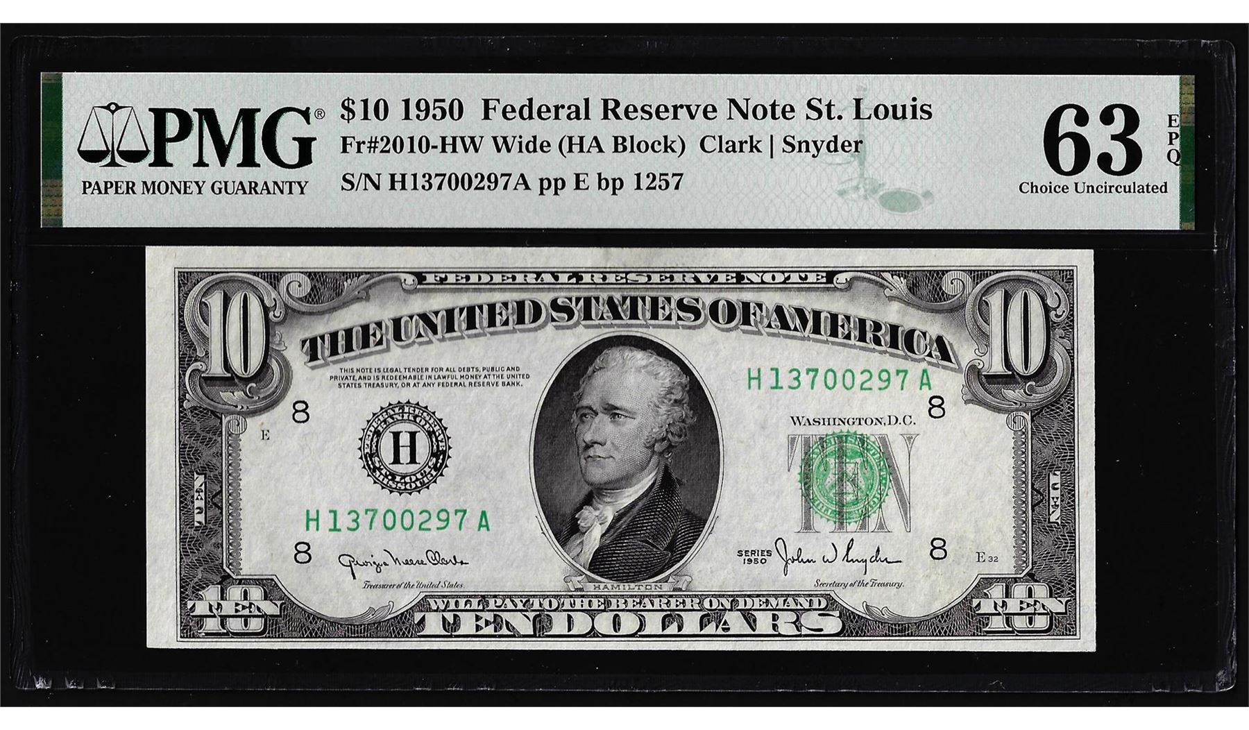One 1950 $10 Federal Reserve Note St. Louis Fr.2010-HW Wide PMG Choice Uncirculated 63EPQ. PMG Certified.