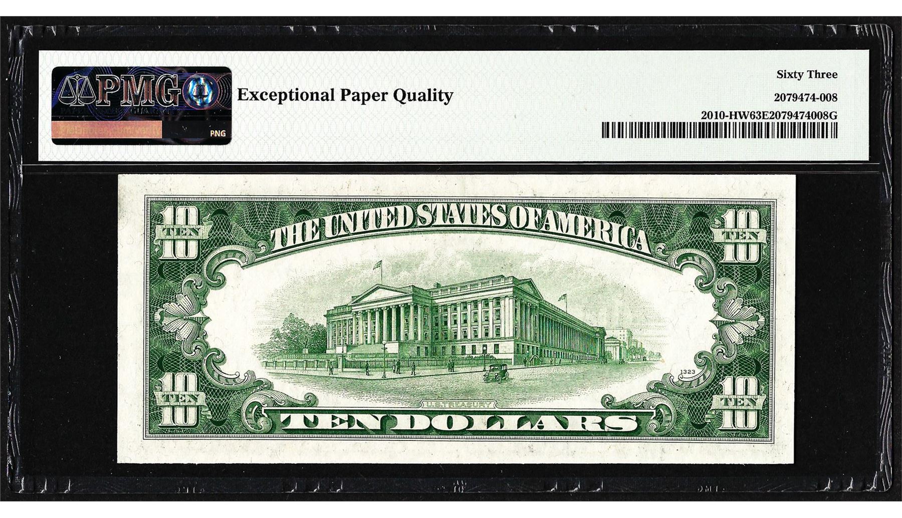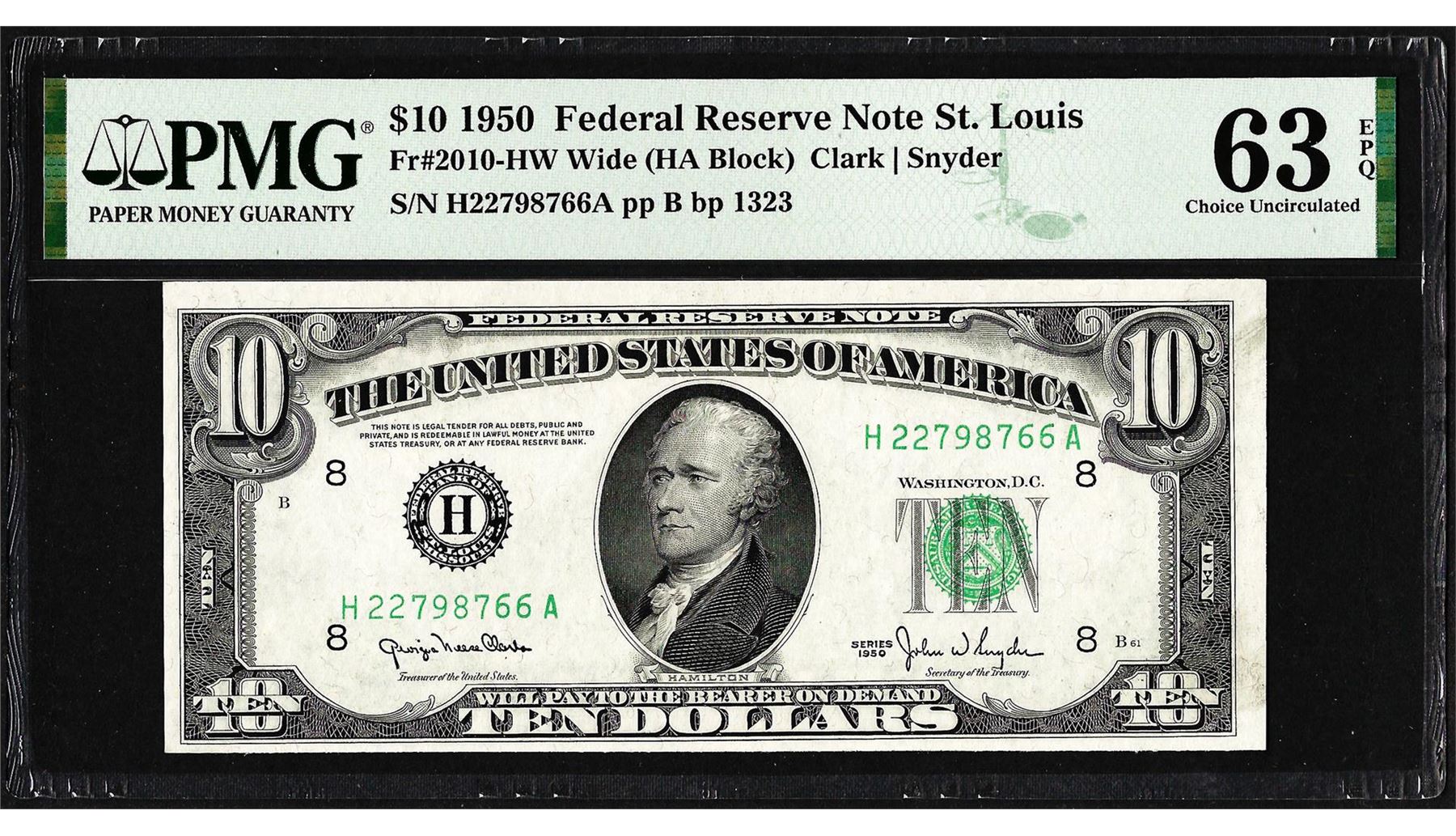 One 1950 $10 Federal Reserve Note St. Louis Fr.2010-HW Wide PMG Choice Uncirculated 63EPQ. PMG Certified.