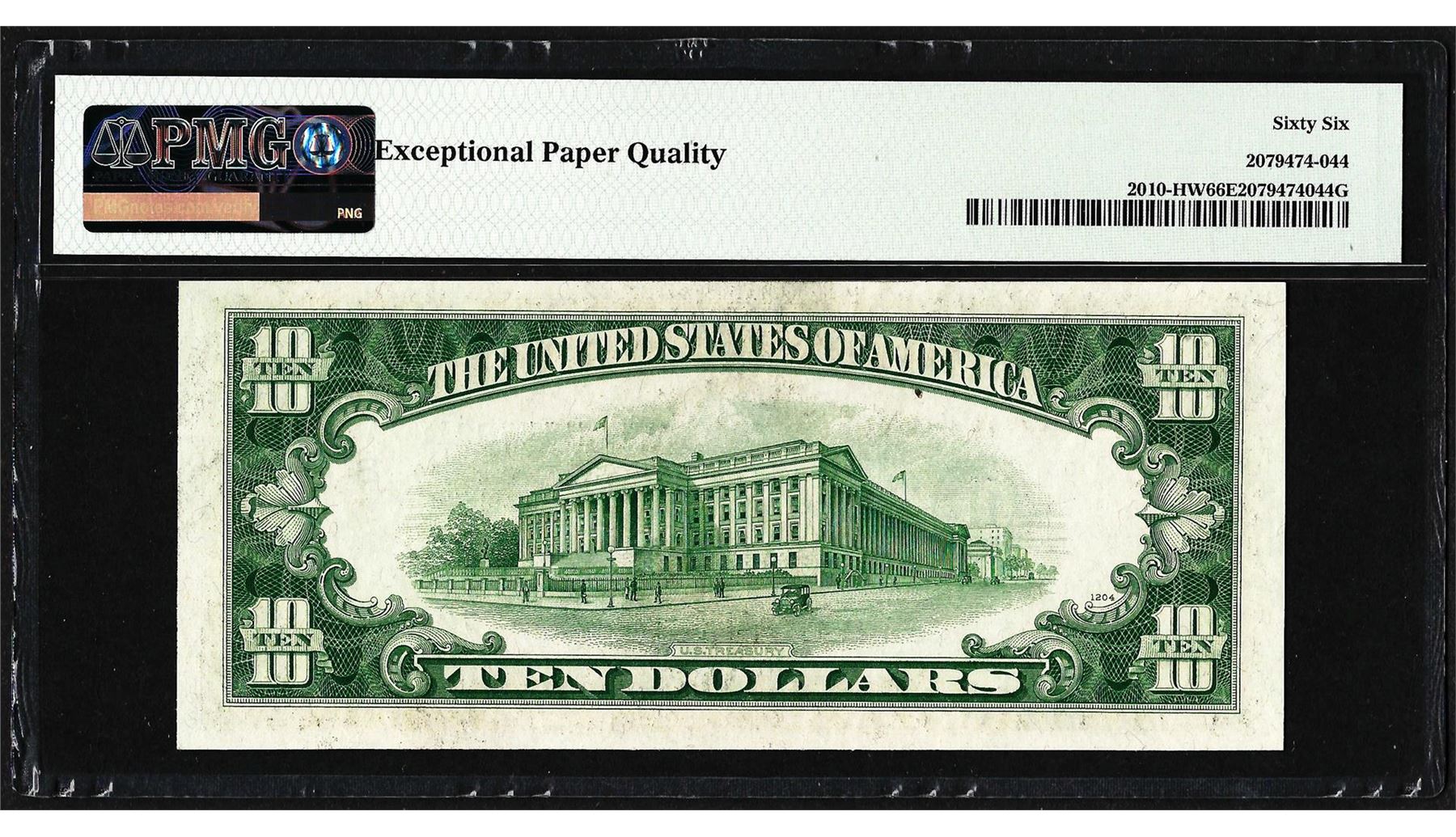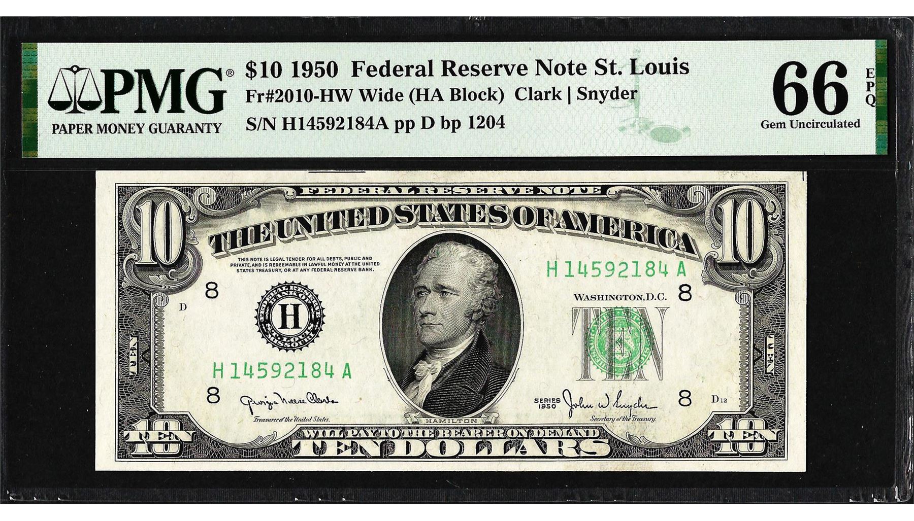 One 1950 $10 Federal Reserve Note St. Louis Fr.2010-HW Wide PMG Gem Uncirculated 66EPQ. PMG Certified.