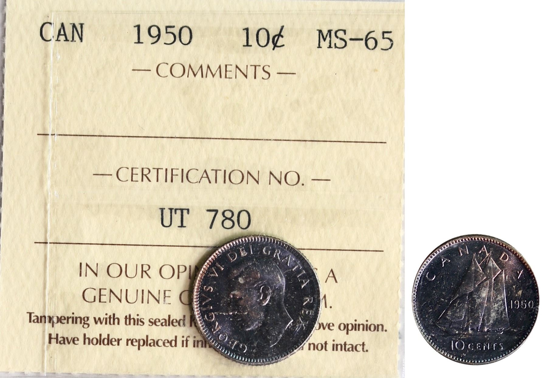 1950 10¢ ICCS Gem Mint State-65, Superb toning over full underlying lustre