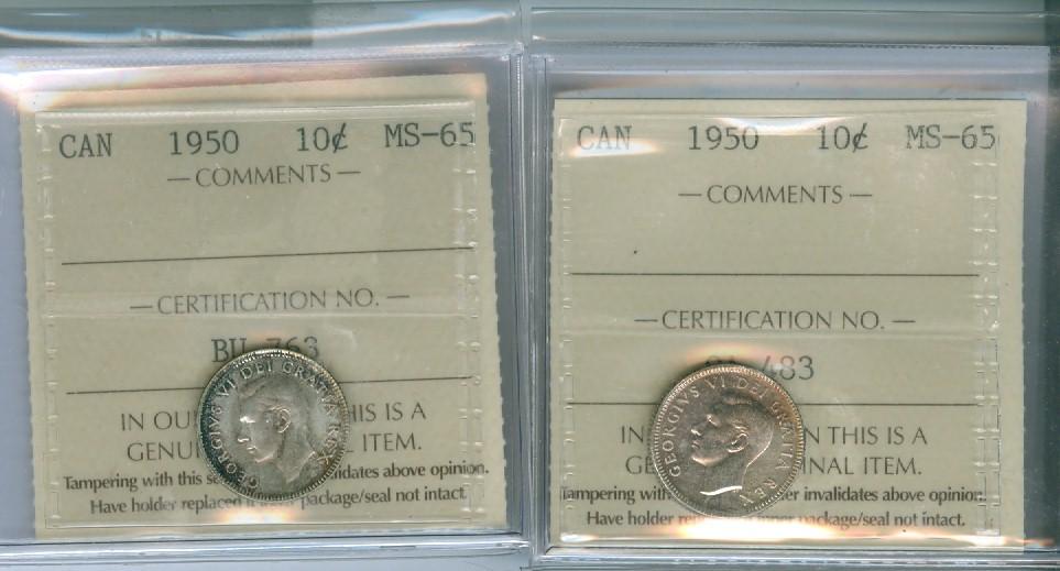 1950 10¢ ICCS MS65. Lot of two coins both lustrous.