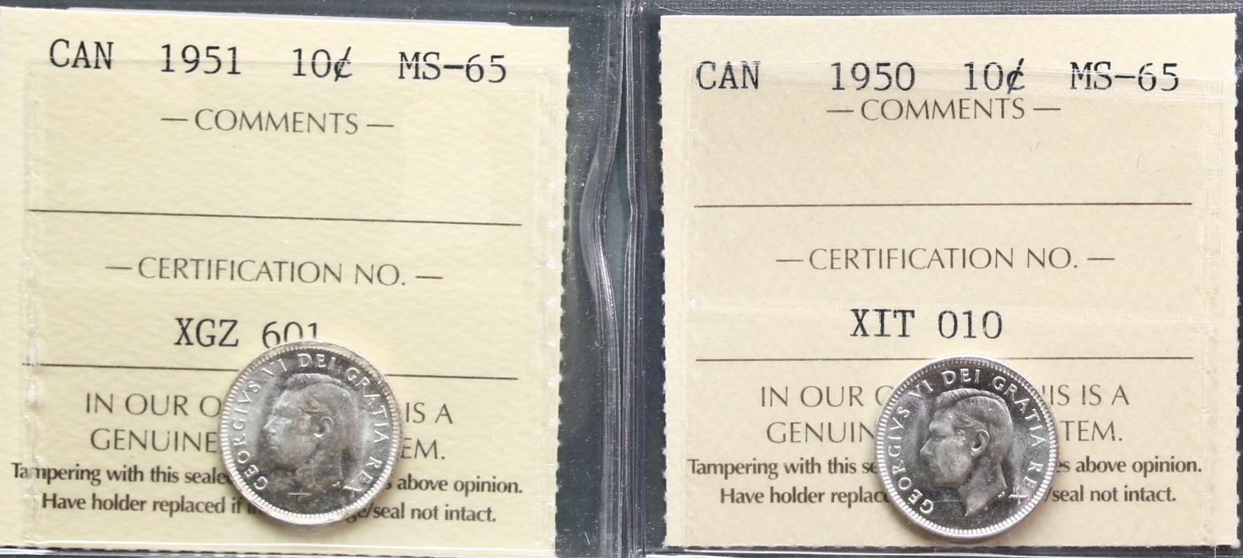 1950 10¢, and 1951 both ICCS Gem Mint State-65.