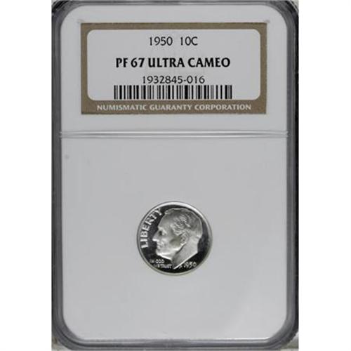 <B>1950 10C PR67 Deep Cameo NGC.</B></I> The Ultra Cameo designation noted on the slab is well-deserved, with the obverse displaying extremely strong contrast and the reverse also showing contrast, though admittedly it is a bit weaker. Untoned and very pleasing, with just a few minor hairline scratches visible upon magnification.<BR><BR><b>Shipping:</b> Coins & Currency (<a target="_blank" href="http://www.heritageauctions.com/common/shipping.php">view shipping information</a>)