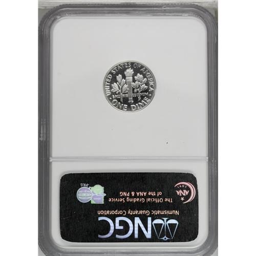 <B>1950<10C> PR68 Cameo NGC.</B></I> This example is exceptionally well struck with fully brilliant obverse and reverse surfaces. The devices have frosty white luster and the fields are deeply mirrored. All of the 1950 proof coins, from cent to half dollar, are quite rare with any type of contrast, and this example, approaching ultra cameo contrast as it does, is highly important. Census: 25 in 68, 0 finer (4/06).