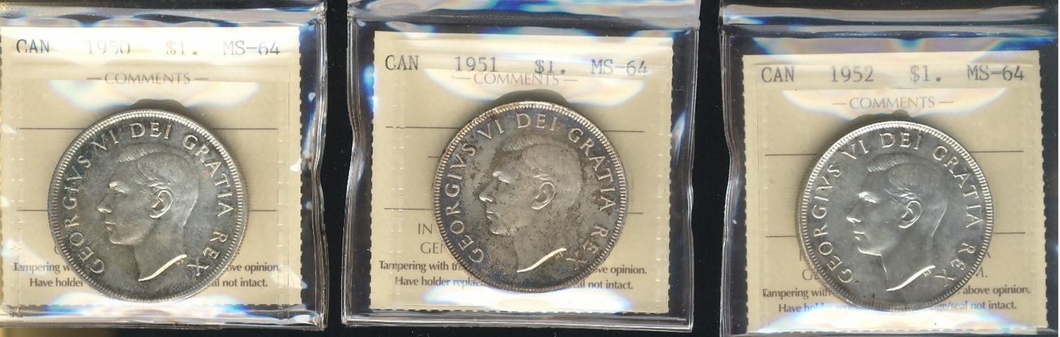 1950, 1951, 1952 WL $1 all ICCS MS64, Lot of 3 coins,