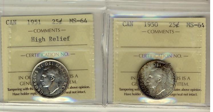 1950 & 1951 HR 25¢ ICCS MS64. Lot of 2 coins.