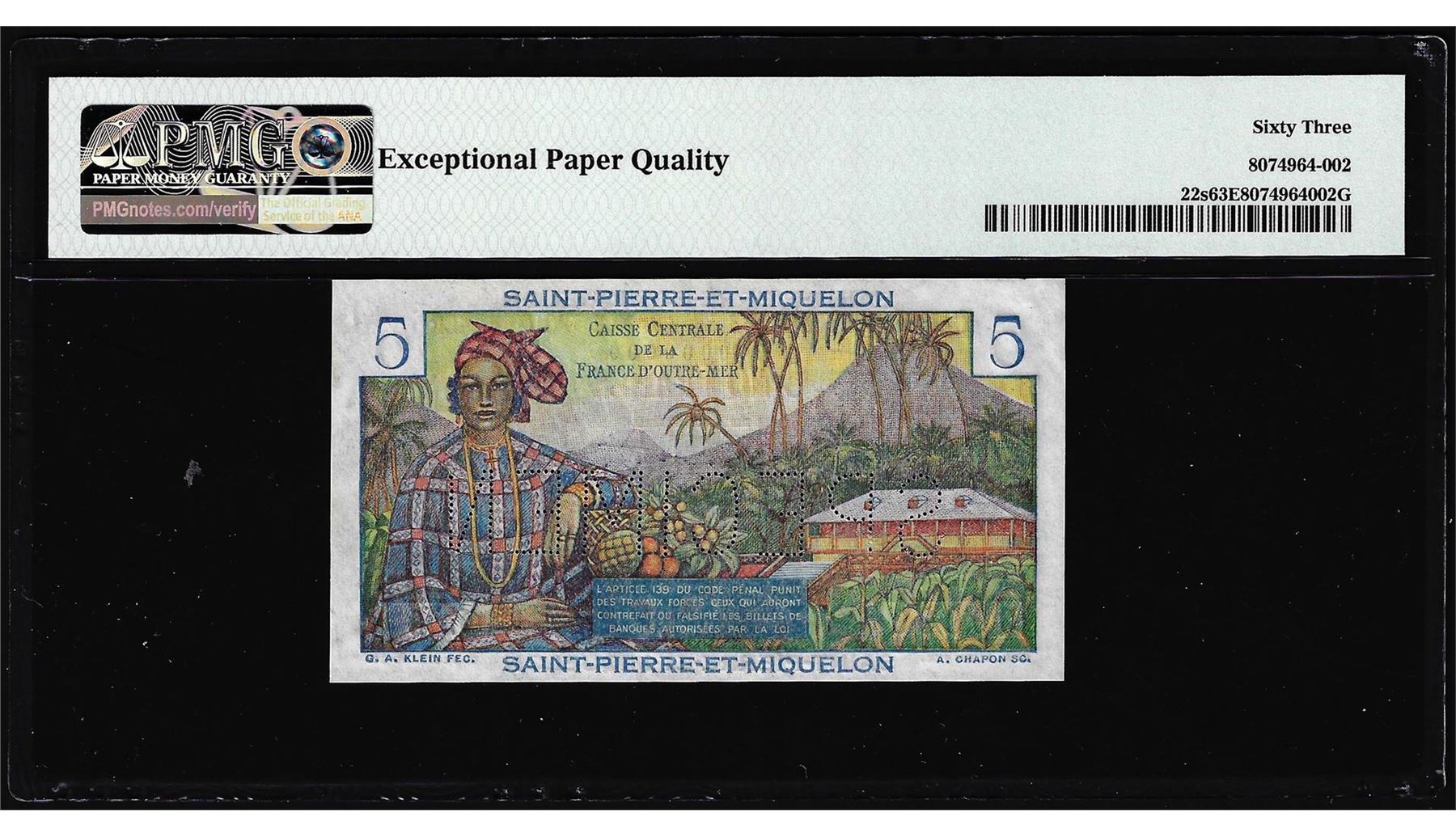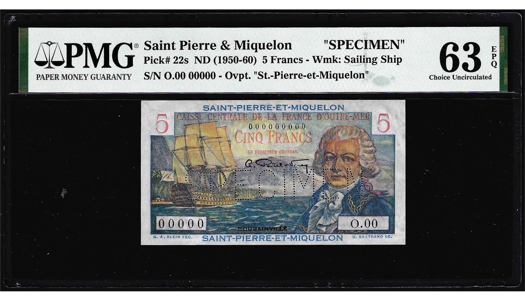 One 1950-1960 Saint Pierre & Miquelon 5 Francs Specimen Note Pick# 22s PMG Choice Uncirculated 63EPQ. PMG Certified.