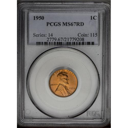 <B>1950<1C> MS67 Red PCGS.</B></I> Bright brick Red throughout and pleasing. The strike is sharp on all devices and lettering. Extensive die polish lines are present on the lower reverse, and there is a thin die crack on Lincoln's shoulder. As nice as this date is ever found. Population: 17 in 67, 0 finer (3/06).<BR><I>From The Kendall Marie #4 All-Time Finest PCGS Registry of Lincoln Cents with Varieties, Circulation Strikes, 1909-1958.</B></I> <BR><BR><B>Important notice:</B> Heritage usually auctions material at the rate of 200-250 lots per hour. On some occasions eBay Live bid software or the Internet may not be able to keep up with the pace of the auction. We recommend placing a realistic absentee bid now as insurance to avoid disappointment. Occasionally the auctioneer may eliminate or reject an eBay Live bid, and the auctioneer may also reopen a lot after the close of the eBay live bidding (usually because we missed an audience bid), and may reject your bid even if it shows you as the winning bidder. By bidding via eBay Live, you agree that Heritage may award the lot to another bidder at its sole discretion under the circumstances described above or any other reasonable circumstances. Since eBay bids are not shown to us until we open the lot on the floor, we treat those bids just like floor bids. In most cases the floor responds before the eBay bid is presented to us, due to Internet lag time, so for consistency we have made it a policy that floor bids are always considered first over tie eBay live bids. Also please note that all Heritage lots purchased through eBay Live carry a 20% Buyer's Premium. Please make sure you read the Terms and Conditions before you bid. This lot is being auctioned in conjunction with a live floor auction by Heritage Galleries & Auctioneers. All final auction and invoice information will be supplied by Heritage Galleries & Auctioneers, and all other information should be considered preliminary. Lot:573 <BR><BR><B>Winning Notification and Billing:</B> After the FINAL session in this auction is complete, Heritage will send e-mail and snail mail invoices. This process normally takes several days. All final auction and invoice information will be supplied by Heritage Galleries & Auctioneers, and all other information should be considered preliminary. <BR><BR>This auction will be conducted on a live auction floor and over the Internet through eBay Live. If you choose to place an absentee bid, please take a moment to <font color='#0000ff'><u><a href='http://pages.ebay.com/liveauctions/help/before/laabsentee.html'>learn how eBay Live absentee bidding works</a></u></font><font color='#000000'>