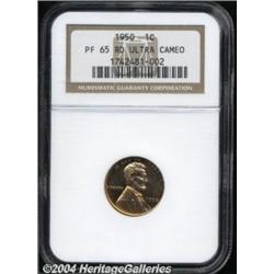 <B>1950<1C> PR65 Red Ultra Cameo NGC.</B></I> Fully struck and exquisitely preserved, with a couple of tiny ticks on the portrait, the cherry-red surfaces are deeply mirrored and display a significant amount of contrast on each side. Scarce as such. Population: 13 in 65 Red Ultra Cameo, 14 finer (7/04). <BR><BR><B>Important notice:</B> Heritage usually auctions material at the rate of 200-250 lots per hour. On some occasions eBay Live bid software or the Internet may not be able to keep up with the pace of the auction. We recommend placing a realistic absentee bid now as insurance to avoid disappointment. Occasionally the auctioneer may eliminate or reject an eBay Live bid, and the auctioneer may also reopen a lot after the close of the eBay live bidding (usually because we missed an audience bid), and may reject your bid even if it shows you as the winning bidder. By bidding via eBay Live, you agree that Heritage may award the lot to another bidder at its sole discretion under the circumstances described above or any other reasonable circumstances. Since eBay bids are not shown to us until we open the lot on the floor, we treat those bids just like floor bids. In most cases the floor responds before the eBay bid is presented to us, due to Internet lag time, so for consistency we have made it a policy that floor bids are always considered first over tie eBay live bids. Also please note that all Heritage lots purchased through eBay Live carry a 20% Buyer's Premium. Please make sure you read the Terms and Conditions before you bid. </span></font></tr></table></td></tr></table>
