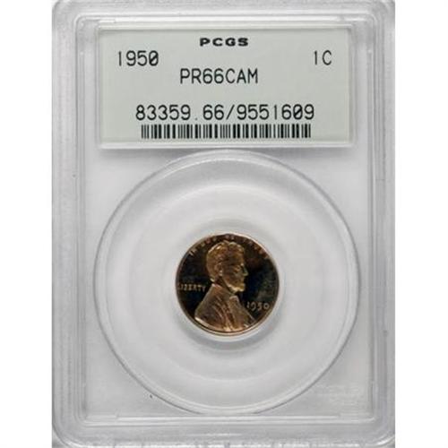 <B>1950 1C PR66 Cameo PCGS.</B></I> Peach, gold, and rose endow this exactingly struck and prominently mirrored Premium Gem. Void of carbon, and rare as such. Encapsulated in an old green label holder. Population: 53 in 66 Cameo, 7 finer (1/08).<BR><BR><b>Shipping:</b> Coins & Currency (<a target="_blank" href="http://www.heritageauctions.com/common/shipping.php">view shipping information</a>)