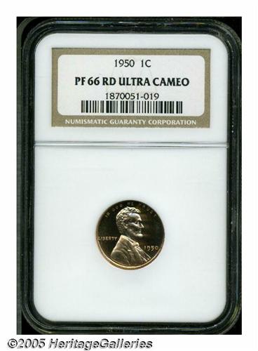 <B>1950<1C> PR66 Red Ultra Cameo NGC.</B></I> A beautiful pumpkin-gold premium Gem. Radiant devices contrast with undisturbed mirrored fields. Population: 8 in 66 Red Ultra Cameo, 11 finer (6/05).