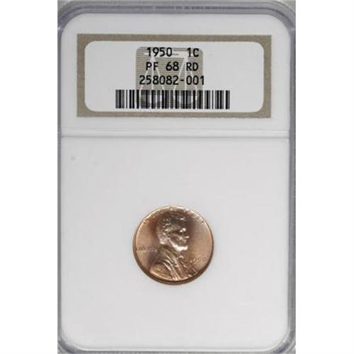 <B>1950 1C PR68 Red NGC.</B></I> An enticing and exquisitely preserved example of this important mid-century proof issue, predominantly peach with a near-vertical band of lemon-gold at the center of the obverse. Census: 6 in 68 Red, 0 finer (10/07).<BR><BR><B>Coin Engraver:</B> Victor D. Brenner<BR><BR><b>Shipping:</b> Coins & Currency (<a target="_blank" href="http://www.heritageauctions.com/common/shipping.php">view shipping information</a>)